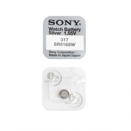 Высококачественная часовая батарейка Sony 317 (SR516SW) используется в часах с низким и равномерным потреблением электроэнергии. К таким часам относятся электронные часы со стрелками, так называемые аналоговые часы и цифровые часы, жидкокристаллические, без дополнительных функции и без подсветки циферблата. Оригинальная часовая батарейка от Sony никогда не протечёт и не испортит, таким образом, механизм ваших наручных часов. А так же можно сказать, что срок службы этой батарейки может составить от 3 до 5 лет, при обязательных условиях, что часовой механизм в ваших часах высококлассный, а сама замена батарейки прошла в авторизованной, профессиональной часовой мастерской.