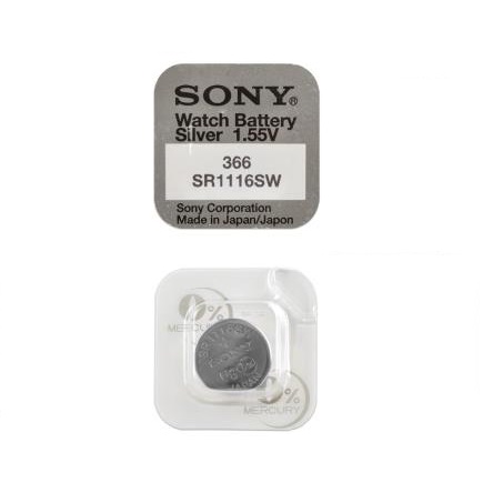 Высококачественная часовая батарейка Sony 366 (SR1116SW) используется в часах с низким и равномерным потреблением электроэнергии. К таким часам относятся электронные часы со стрелками, так называемые аналоговые часы и цифровые часы, жидкокристаллические, без дополнительных функции и без подсветки циферблата. Так же имеется в таком же форм-факторе часовая батарейка Sony 365 (SR1116W), которая используется в наручных часах с высоким и неравномерным электропотреблением: аналоговые и цифровые часы с дополнительными функциями и подсветкой циферблата, а так же в игровых микро приставках, радиобрелках, камерах и т. д. Оригинальная часовая батарейка от Sony никогда не протечёт и не испортит механизм ваших наручных часов. А так же можно сказать, что срок службы этой батарейки может составить от 3 до 5 лет, при обязательных условиях, что часовой механизм в ваших часах высококлассный, а сама замена батарейки прошла в авторизованной, профессиональной часовой мастерской.