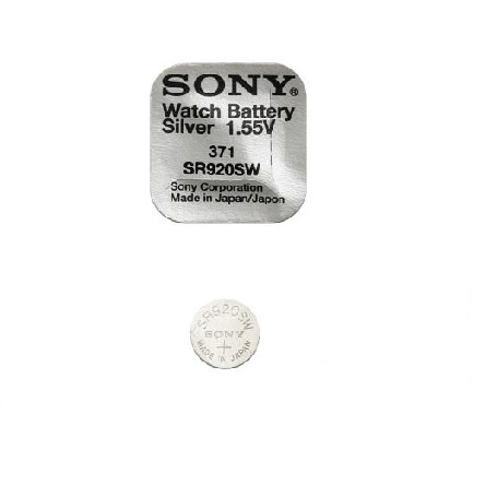 Высококачественная часовая батарейка Sony 371 (SR920SW) используется в часах с низким и равномерным потреблением электроэнергии. К таким часам относятся электронные часы со стрелками, так называемые аналоговые часы и цифровые часы, жидкокристаллические, без дополнительных функции и без подсветки циферблата. Так же имеется в таком же форм-факторе часовая батарейка Sony 370 (SR920W), которая используется в наручных часах с высоким и неравномерным электропотреблением: аналоговые и цифровые часы с дополнительными функциями и подсветкой циферблата, а так же в игровых микро приставках, радиобрелках, камерах и т. д. Оригинальная часовая батарейка от Sony никогда не протечёт и не испортит механизм ваших наручных часов. А так же можно сказать, что срок службы этой батарейки может составить от 3 до 5 лет, при обязательных условиях, что часовой механизм в ваших часах высококлассный, а сама замена батарейки прошла в авторизованной, профессиональной часовой мастерской.