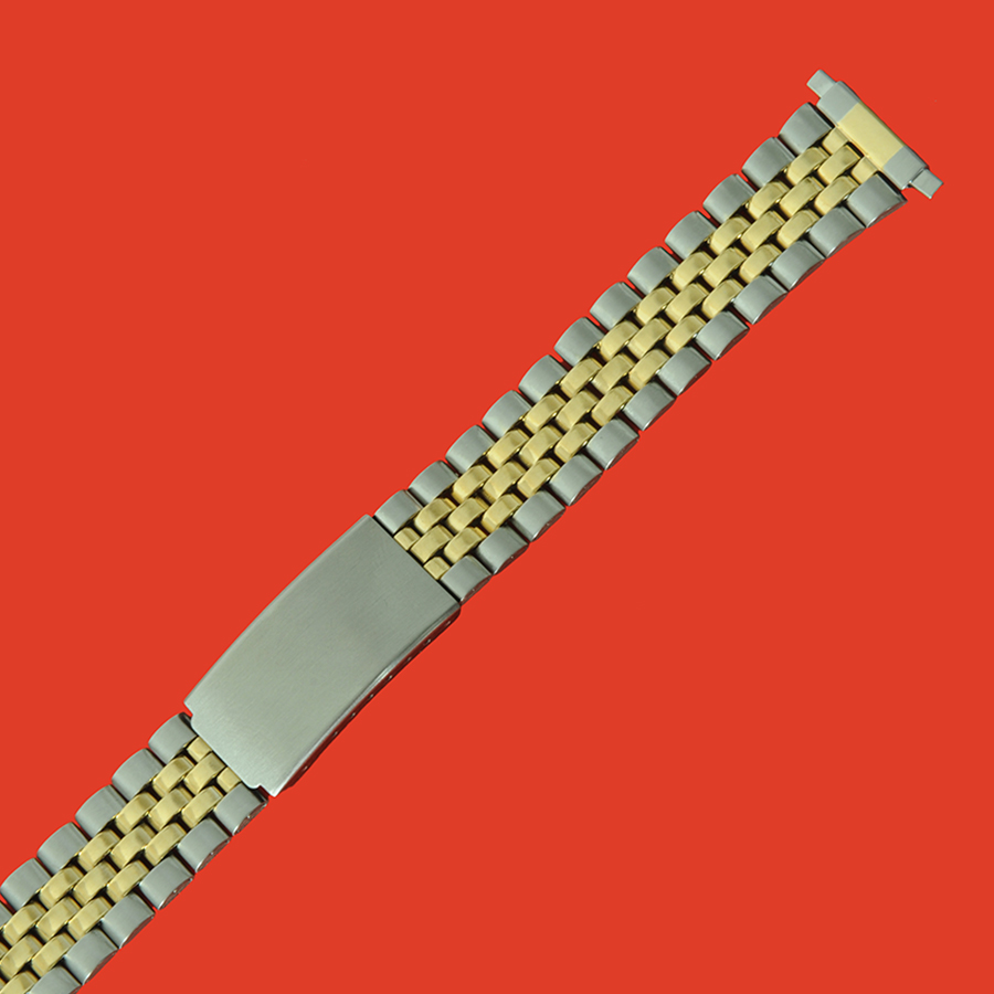 Высококачественный металлический браслет для часов изготовлен из нержавеющей стали методом штамповки звеньев и последующим их соединением. Конструкция браслета не разъемная, а установочный размер — телескопический, имеющий диапазон от 16 до 22 мм. Покрытие очень крепкое и стойкое к внешним природным воздействиям, к истиранию и царапинам, из нитрида титана (TiN), комбинированное — под белый металл и под цвет золота. Данный металлический браслет подходит к моделям часов средней ценовой категории и выше.