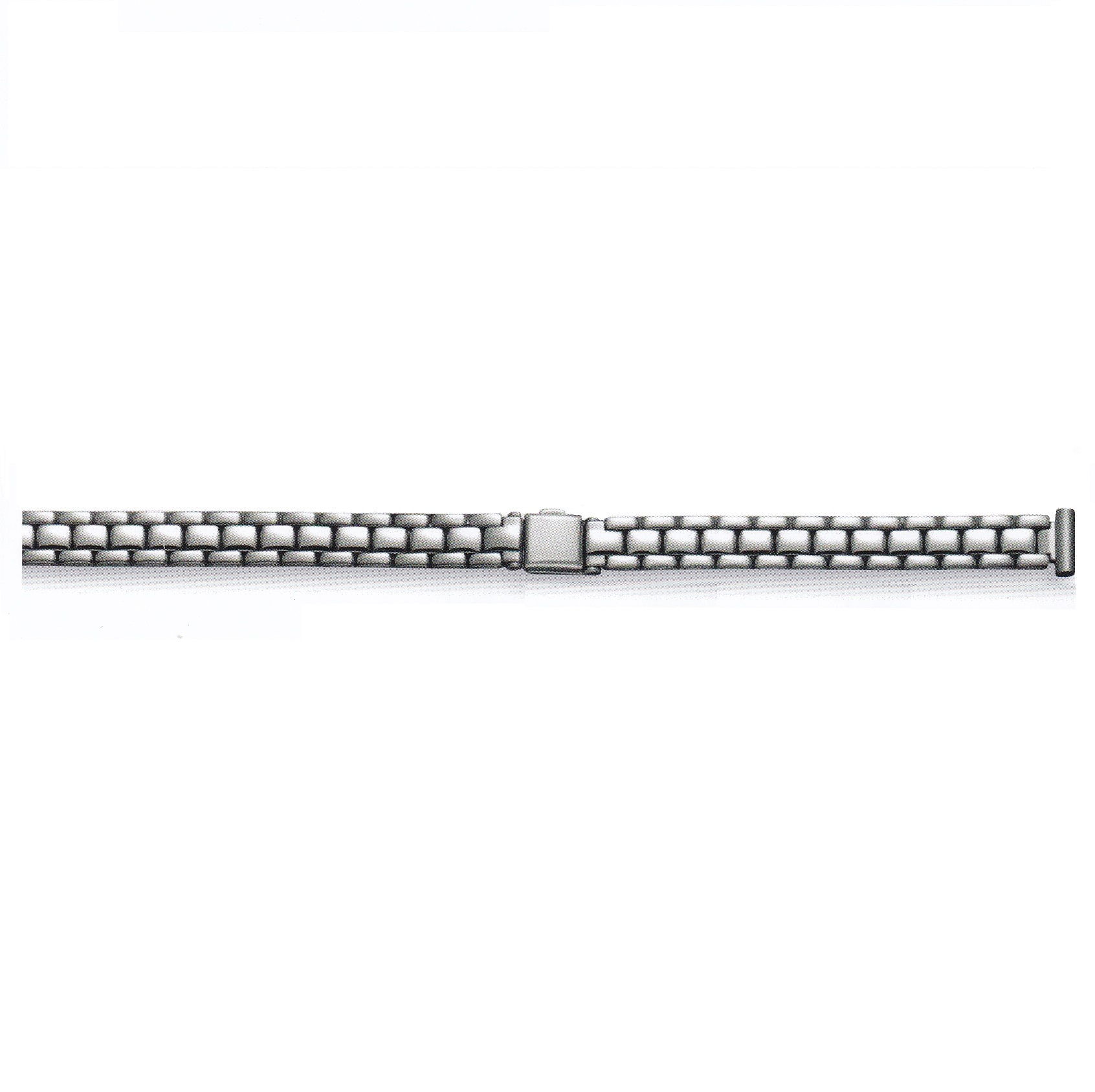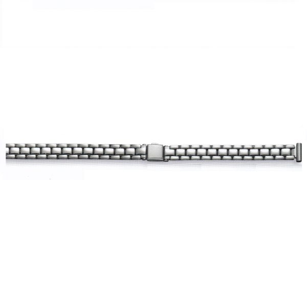 Высококачественный металлический браслет для часов изготовлен из нержавеющей стали 316L методом штамповки звеньев и последующим их соединением. Конструкция браслета не разъемная, установочный размер равен 10 мм, с возможностью уменьшить до 6мм. Ширина пряжки равна 8 мм и она снабжена двумя боковыми, запорными кнопками. Покрытие очень крепкое и стойкое к внешним природным воздействиям, к истиранию и царапинам из нитрида титана (TiN), цвет — белый металл. Имеется такая же модель и в цвете под цвет золота из того же покрытия. Данный металлический браслет подходит к женским наручным часам средней ценовой категории и выше.