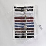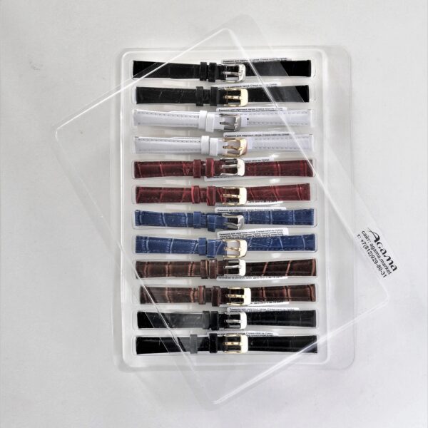 Групповой прозрачный блистер служит для хранения и экспонирования 12 часовых ремешков. Ячейки в блистере имеют размеры, в среднем, 14,5 мм х 130 мм х 10 мм, поэтому любой ремешок имеющий основной установочный размер меньше или равный 14 мм прекрасно ложится в такую ячейку. Выкладка ремешков получается аккуратной и ровной и при использовании группы таких блистеров на витрине прилавка создает приятное и притягательное отношение покупателя (посетителя часового магазина) к выставленной коллекции, а для продавца оперативность в продажах и не обременительной аккуратной выкладке товара. Если не предполагается выставлять блистеры в витрину или витрина мала для большой коллекции ремешков, а желание такое остаётся, то тогда для группового хранения и экспонирования ремешков в этих блистерах существует специальная стойка трансформер.