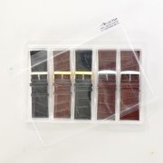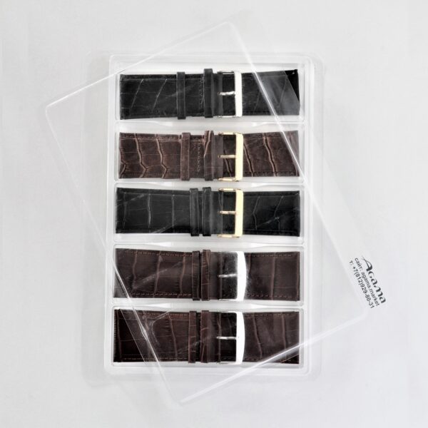 Групповой прозрачный блистер служит для хранения и экспонирования 5 часовых ремешков. Ячейки в блистере имеют размеры, в среднем, 37 мм х 130 мм х 14,2 мм, поэтому любой ремешок имеющий основной установочный размер меньше или равный 36 мм прекрасно ложится в такую ячейку. Выкладка ремешков получается аккуратной и ровной и при использовании группы таких блистеров на витрине прилавка создает приятное и притягательное отношение покупателя (посетителя часового магазина) к выставленной коллекции, а для продавца оперативность в продажах и не обременительной аккуратной выкладке товара. Если не предполагается выставлять блистеры в витрину или витрина мала для большой коллекции ремешков, а желание такое остаётся, то тогда для группового хранения и экспонирования ремешков в этих блистерах существует специальная стойка трансформер.