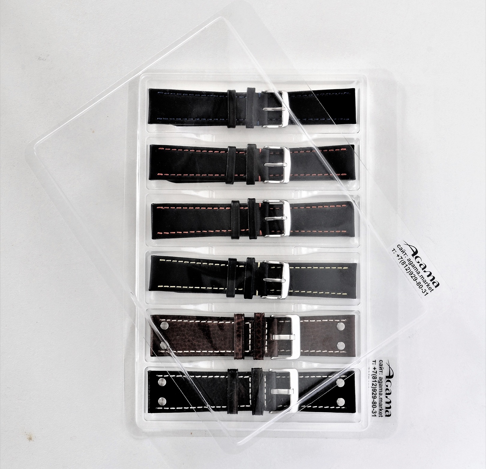 Групповой прозрачный блистер служит для хранения и экспонирования 6 часовых ремешков. Ячейки в блистере имеют размеры, в среднем, 31 мм х 130 мм х 14,2 мм, поэтому любой ремешок имеющий основной установочный размер меньше или равный 30 мм прекрасно ложится в такую ячейку. Выкладка ремешков получается аккуратной и ровной и при использовании группы таких блистеров на витрине прилавка создает приятное и притягательное отношение покупателя (посетителя часового магазина) к выставленной коллекции, а для продавца оперативность в продажах и не обременительной аккуратной выкладке товара. Если не предполагается выставлять блистеры в витрину или витрина мала для большой коллекции ремешков, а желание такое остаётся, то тогда для группового хранения и экспонирования ремешков в этих блистерах существует специальная стойка трансформер.