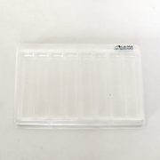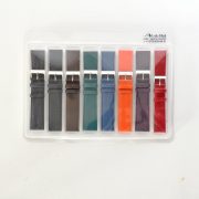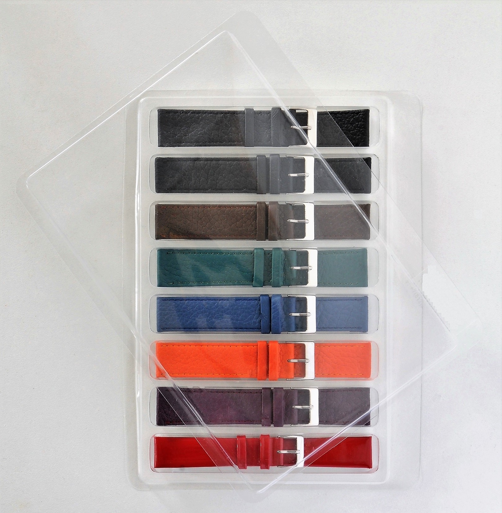 Групповой прозрачный блистер служит для хранения и экспонирования 8 часовых ремешков. Ячейки в блистере имеют размеры, в среднем, 24 мм х 130 мм х 12 мм, поэтому любой ремешок имеющий основной установочный размер меньше или равный 24 мм прекрасно ложится в такую ячейку. Выкладка ремешков получается аккуратной и ровной и при использовании группы таких блистеров на витрине прилавка создает приятное и притягательное отношение покупателя (посетителя часового магазина) к выставленной коллекции, а для продавца оперативность в продажах и не обременительной, аккуратной выкладке товара. Если не предполагается выставлять блистеры в витрину или витрина мала для большой коллекции ремешков, а желание такое остаётся, то тогда для группового хранения и экспонирования ремешков в этих блистерах существует специальная стойка трансформер.