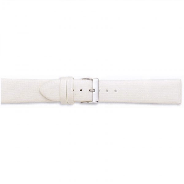 Инновационный и элегантный часовой ремешок, у которого верх изготовлен из специального полиуретана, имитирующего тканый хлопковый материал — сатин, а низ — из подкладочной натуральной кожи крупного рогатого скота. Такое сочетание материалов придают ремешку отличные потребительские и эстетические качества, такие как долговечность, комфортность в носке и стойкость окраса и формы. Цвет — жемчужно — белый. Пряжка фактурная, элегантная и удобная в носке, из полированной нержавеющей стали белого цвета. Данный кожаный часовой ремешок подходит к классическим часам со средней ценовой категорией и выше. Эта модель доступна в установочных размерах 14 мм, 16 мм, 18 мм, 20 мм и 22 мм и в разных цветовых исполнениях: светло — голубом, светло — розовом, золотом, серебряном и черном с искрой цветах.