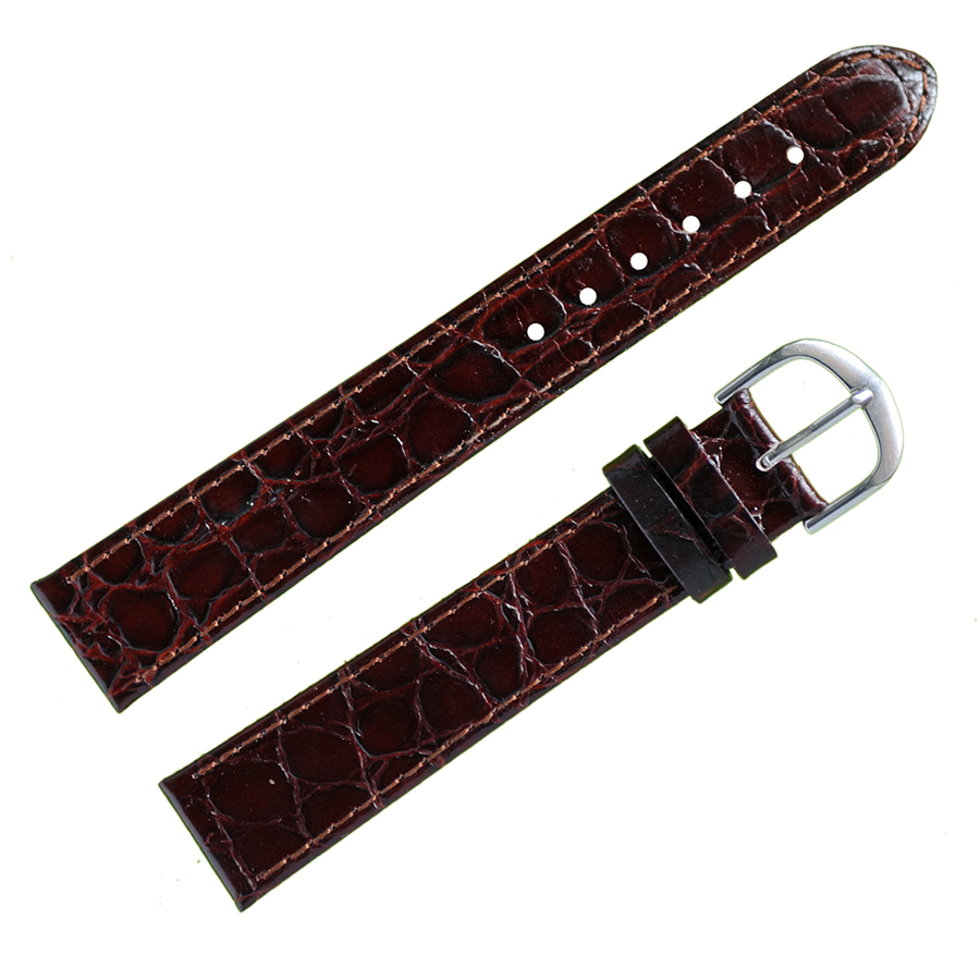 Высококачественный кожаный часовой ремешок в стиле «Классика». Элегантный ремешок для часов изготовлен из кожи теленка (так называемой «итальянской кожи», из-за высокого качества выделки), имитирующая кожу крокодила, глянцевый, цвет черный («Nero») со строчкой, по краю, в цвет ремешка. Конструкция ремешка — удлиненная, зауженная к пряжке, плоская, конец длинной части ремешка имеет заостренную форму. Пряжка классическая, элегантная и удобная в носке. Изготовлена из нержавеющей стали, цвет-белый металл. Возможно заказать блестящую пряжку двух цветов: белый металл или под цвет золота (смотрите в каталоге). Данный кожаный часовой ремешок подходит к наручным часам со средней ценовой категорией и выше.