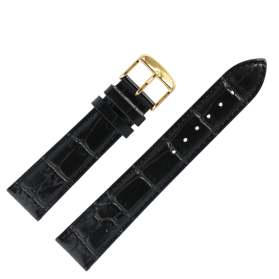 Элитный кожаный часовой ремешок в стиле «Классика». Элегантный ремешок для часов, изготовлен из кожи теленка (так называемой «итальянской кожи», из-за высокого качества выделки),  имитирующей кожу  крокодила, цвет черный («Nero»), матовый, со строчкой, по краю, в цвет ремешка . Пряжка фактурная, элегантная и удобная в носке. Можно заказать блестящую пряжку двух цветов:  белый металл или под цвет золота (смотрите в каталоге). Данный кожаный часовой ремешок подходит к классическим часам со средней ценовой категорией и выше.
