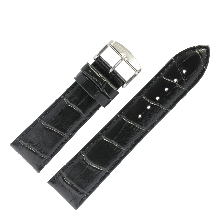 Элитный часовой ремешок в стиле «Классика». Элегантный ремешок, изготовлен из кожи теленка (так называемой «итальянской кожи», из-за высокого качества выделки), имитирующей кожу крокодила, цвет черный («Nero»), матовый, со строчкой, по краю, в цвет ремешка . Пряжка фактурная, элегантная и удобная в носке. Можно заказать блестящую пряжку двух цветов: белый металл или под цвет золота (смотрите в каталоге). Это изделие подходит к классическим часам со средней ценовой категорией и выше.