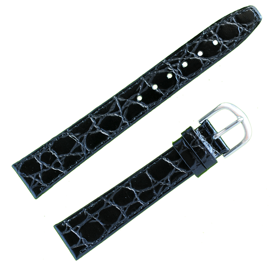 Высококачественный кожаный часовой ремешок в стиле «Классика». Элегантный ремешок для часов изготовлен из кожи теленка (так называемой «итальянской кожи», из-за высокого качества выделки), имитирующая кожу крокодила, цвет- черный, полуглянцевый. Конструкция ремешка — классическая, зауженная к пряжке. Конец длинной части ремешка имеет трапецевидную форму. Пряжка классическая, элегантная и удобная в носке. Изготовлена из нержавеющей стали, цвет-белый металл. Возможно заказать блестящую пряжку двух цветов: белый металл или под цвет золота (смотрите в каталоге). Данный кожаный часовой ремешок подходит к наручным часам со средней ценовой категорией и выше.