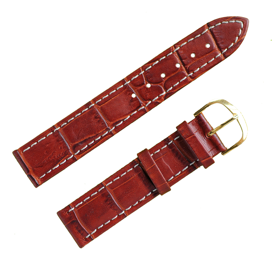 Высококачественный кожаный часовой ремешок в стиле «Спорт». Элегантный ремешок для часов изготовлен из кожи теленка (так называемой «итальянской кожи», из-за высокого качества выделки), имитирующая кожу алигатора, матовый, с белой контрастной строчкой, по краю. Конструкция ремешка — зауженная к пряжке, полупухлая, конец длинной части ремешка имеет заостренную форму. Пряжка классическая, элегантная и удобная в носке. Изготовлена из нержавеющей стали, под цвет золота. Возможно заказать блестящую пряжку двух цветов: белый металл или под цвет золота (смотрите в каталоге). Данный кожаный часовой ремешок подходит к наручным часам со средней ценовой категорией и выше.