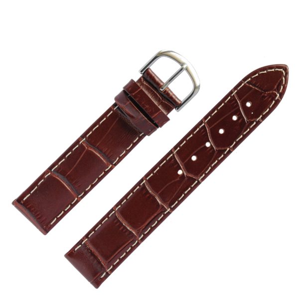 Высококачественный кожаный часовой ремешок в стиле «Спорт». Элегантный ремешок для часов изготовлен из кожи теленка (так называемой «итальянской кожи», из-за высокого качества выделки), имитирующая кожу алигатора, матовый, с белой контрастной строчкой, по краю. Конструкция ремешка — зауженная к пряжке, полупухлая, конец длинной части ремешка имеет заостренную форму. Пряжка классическая, элегантная и удобная в носке. Изготовлена из нержавеющей стали, под цвет белого металла . Возможно заказать блестящую пряжку двух цветов: белый металл или под цвет золота (смотрите в каталоге). Данный кожаный часовой ремешок подходит к наручным часам со средней ценовой категорией и выше.