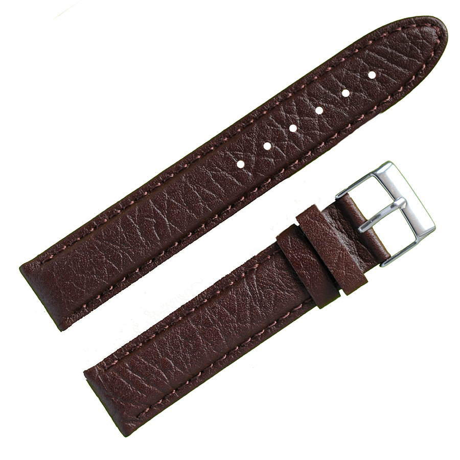 Высококачественный кожаный часовой ремешок в стиле «Классика». Элегантный ремешок для часов, изготовлен из кожи теленка (так называемой «итальянской кожи», из-за высокого качества выделки), цвет коричневый («темношоколадный»), матовый, со строчкой, по краю, в цвет ремешка . Конструкция ремешка — классическая, прямая. Конец длинной части ремешка имеет элепсовидную форму. Пряжка фактурная, элегантная и удобная в носке. Изготовлена из нержавеющей стали с покрытием из оксида титана, цвет — белый металл. Возможно заказать блестящую пряжку двух цветов: белый металл или под цвет золота (смотрите в каталоге). Данный кожаный часовой ремешок подходит к наручным часам со средней ценовой категорией и выше.