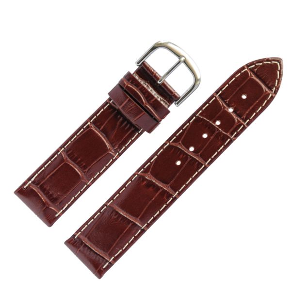 Высококачественный кожаный часовой ремешок в стиле «Спорт». Элегантный ремешок для часов изготовлен из кожи теленка (так называемой «итальянской кожи», из-за высокого качества выделки), имитирующая кожу алигатораматовый,  с белой контрастной строчкой, по краю. Конструкция ремешка — зауженная к пряжке, полупухлая, конец длинной части ремешка имеет заостренную форму.  Пряжка классическая, элегантная и удобная в носке. Изготовлена из нержавеющей сталипод цвет белого металла. Возможно заказать блестящую пряжку двух цветов: белый металл или под цвет золота (смотрите в каталоге). Данный кожаный часовой ремешок подходит к наручным  часам со средней ценовой категорией и выше.