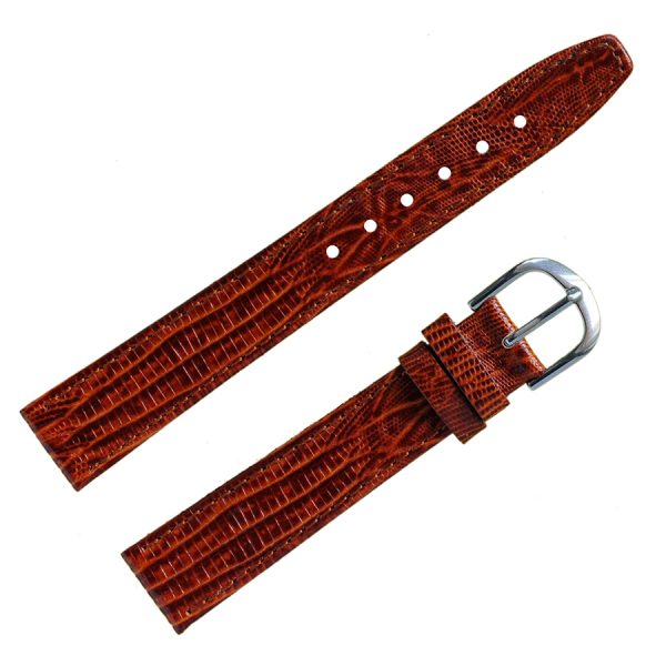 Высококачественный кожаный часовой ремешок в стиле «Классика». Элегантный ремешок для часов изготовлен из кожи теленка (так называемой «итальянской кожи», из-за высокого качества выделки), имитирующая кожу ящерицы, цвет светло-коричневый, с темными прожилками, полуглянцевый. Конструкция ремешка — классическая, зауженная к пряжке. Конец длинной части ремешка имеет трапецевидную форму. Пряжка классическая, элегантная и удобная в носке. Изготовлена из нержавеющей стали, цвет-белый металл. Возможно заказать блестящую пряжку двух цветов: белый металл или под цвет золота (смотрите в каталоге). Данный кожаный часовой ремешок подходит к наручным часам со средней ценовой категорией и выше.