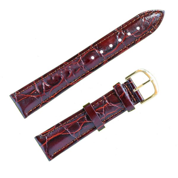 Высококачественный кожаный часовой ремешок в стиле «Классика». Элегантный ремешок для часов, изготовлен из кожи теленка (так называемой «итальянской кожи», из-за высокого качества выделки), имитирующая кожу крокодила, полуматовый, со строчкой по краю, под цвет кожи ремешка. Конструкция ремешка — плавно зауженная к пряжке, пухлая, конец длинной части ремешка имеет заостренную форму. Пряжка классическая, элегантная и удобная в носке, изготовлена из нержавеющей стали, под цвет золота. Возможно заказать блестящую пряжку двух цветов: белый металл или под цвет золота (смотрите в каталоге). Данный кожаный часовой ремешок подходит к наручным часам со средней ценовой категорией и выше.
