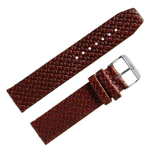 Высококачественный кожаный ремешок для часов, модель «Плетенка». Элегантный ремешок изготовлен из кожи теленка (так называемой «итальянской кожи», из-за высокого качества выделки), полуматовый. Конструкция данного кожаного ремешка для часов — прямая, плоская, конец длинной части ремешка имеет трапецевидную форму. Пряжка фактурная, элегантная и удобная в носке. Изготовлена из полированной нержавеющей стали. Возможно заказать блестящую пряжку двух цветов: белый металл или под цвет золота (смотрите в каталоге). Это изделие подходит к наручным часам со средней ценовой категорией и выше.