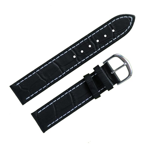 Высококачественный кожаный часовой ремешок в стиле «Спорт». Элегантный ремешок для часов изготовлен из кожи теленка (так называемой «итальянской кожи», из-за высокого качества выделки), имитирующая кожу алигатора, матовый,  с белой контрастной строчкой, по краю. Конструкция ремешка — зауженная к пряжке, полупухлая, конец длинной части ремешка имеет заостренную форму.  Пряжка классическая, элегантная и удобная в носке. Изготовлена из нержавеющей стали, под цвет золота. Возможно заказать блестящую пряжку двух цветов: белый металл или под цвет золота (смотрите в каталоге). Данный кожаный часовой ремешок подходит к наручным  часам со средней ценовой категорией и выше.