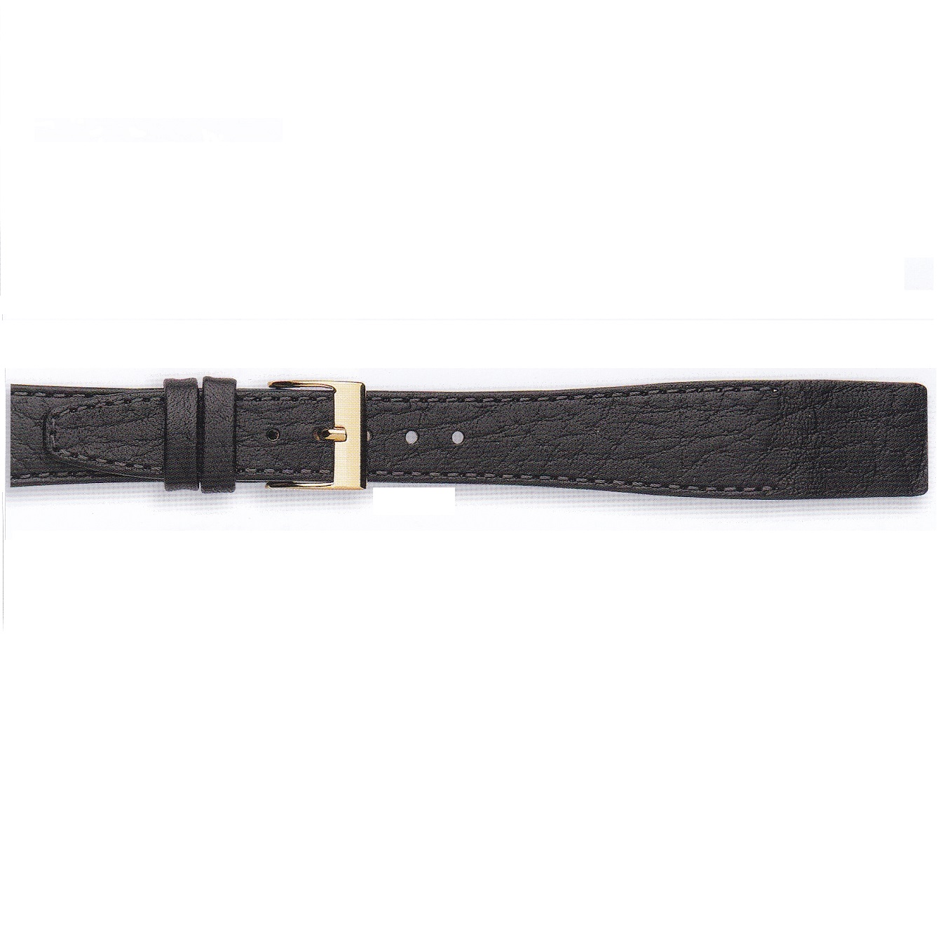 Элегантный ремешок, изготовлен из «итальянской кожи», так называемой, из-за высокого качества производства. В этой модели используется кожа теленка с рисунком, имитирующим кожу верблюда, цвет — черный, поверхность — матовая. Модель ремешка — классическая, плоская, со строчкой, по краю, в цвет кожи ремешка. По технологии изготовления —это «обрезной ремень». Производится в виде слоеного пирога, и состоит из трех, четырех слоев, обрезанных по краям.Эти боковые срезы покрыты эластичным компаундом. Концы открытые, с нанесенным на них клеем (клей активируется при помощи ацетона). Пряжка классическая и удобная в носке, изготовлена из нержавеющей стали с напыленным, на нее, покрытием из нитрида титана (TiN), цвет — под цвет золота. Доступен так же размер в 20 мм. Так же возможно заказать этот размер и в коричневом цвете, модель 601 022 18. Это изделие подходит к наручным часам средней ценовой категории и выше, с несъемными установочными ушками.