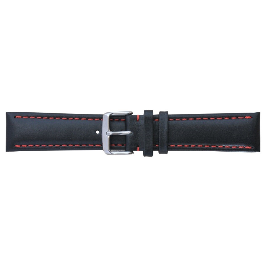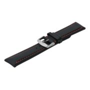 Высококачественный часовой ремешок, модель «Спорт», изготовлен из кожи теленка и так называемой «итальянской кожи», из-за высокого качества производства кожи на кожевенных предприятиях Европы. Цвет — черный, наружная поверхность ремешка — гладкая, полуглянцевая. По технологии изготовления — это «обрезной ремень». Производится в виде слоеного пирога, и состоит из трех, четырех слоев, обрезанных по краям. Эти боковые срезы покрыты эластичным компаундом и, дополнительно, прошиты красной нитью по краю ремешка, и вместе с жесткой внутренней прокладкой придают ремню крепкий, надежный и строгий вид. Конец длинной части ремешка имеет заостренную форму. Пряжка фактурная, элегантная, литая, удобная в носке, изготовлена из нержавеющей стали. Эти ремешки комплектуются только пряжками под цвет белого металла. Доступны так же размеры этой модели 18 мм, 22 мм и 24 мм, а так же имеются модели с цветом прострочки: синего, оранжевого и желтого цвета. Это изделие подходит к наручным часам средней ценовой категории и выше.