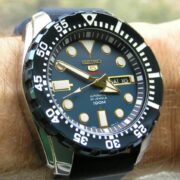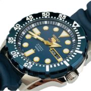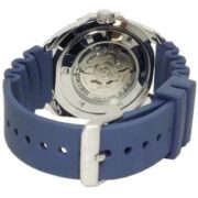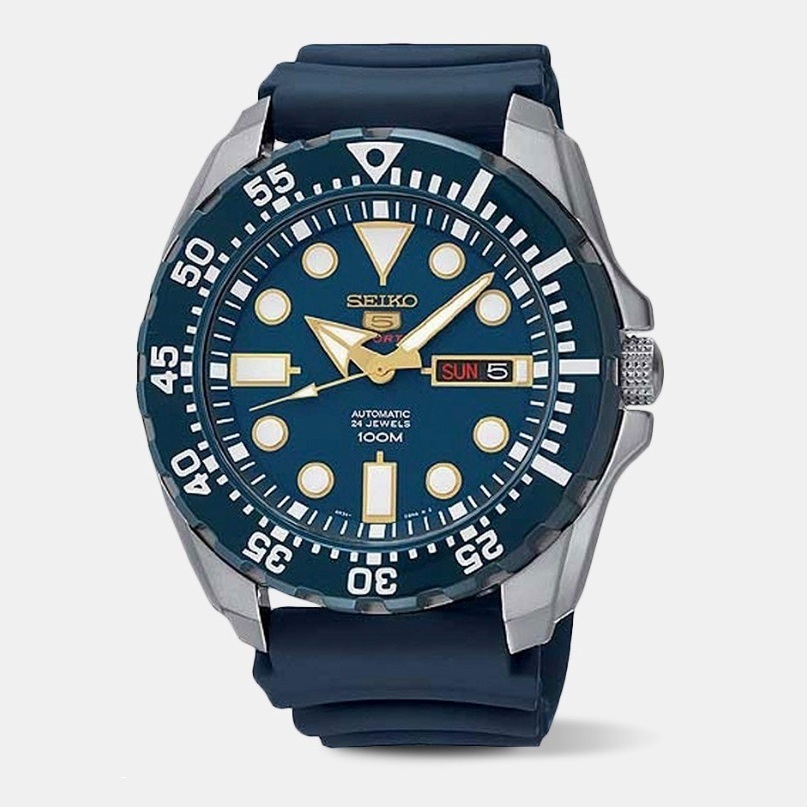 Корпус из нержавеющей стали с синим силиконовым ремешком. Вращающийся в одном направлении синий безель из нержавеющей стали. Синий циферблат с люминесцентными стрелками цвета желтого золота и точечными часовыми метками. Минутные метки по внешнему краю. Тип циферблата: Аналоговый. Люминесцентные стрелки и маркеры. Индикация дня недели и даты в положении «3 часа». Автоматический механизм Seiko калибра 4R36 с 24 драгоценными камнями, частотой вращения 21 600 полуколебаний в час и запасом хода около 41 часа. Данный механизм имеет функции стоп секунды и ручного завода. Стекло Hardlex, устойчивое к царапинам. Заводная головка отвечает, за установку времени, дня недели и даты месяца. Прозрачная задняя крышка с металлическим каркасом, на котором прописан серийный номер. Круглая форма корпуса. Размер корпуса: 44,5 мм. Толщина корпуса: 12,7 мм. Установочный размер ремешка: 22 мм. Застежка Тан. Водонепроницаемость на глубине 100 метров / 330 футов. Функции: дата, день недели, часы, минуты, секунды. Серия Seiko 5 Sports. Стиль — Divers. В комплект входит фирменная упаковочная коробка, тех. описание и руководство пользователя на русском языке, талоны на российскую и международную гарантии (1 год). Есть такая же модель этих часов SRP605J2, но производства Япония.
