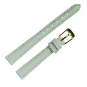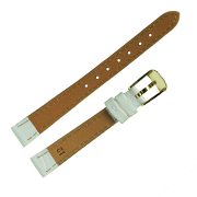Высококачественный часовой ремешок бюджетной серии в стиле «Классика». Элегантный ремешок, у которого, верх, изготовлен из синтетической кожи на основе полиамидных смол, имитирующей кожу крокодила, цвет белый, со строчкой, по краю, в цвет ремешка, полу матовый. Низ или обратная сторона этого ремешка изготовлена из натуральной подкладочной кожи. Важными свойствами готовых изделий из синтетической кожи, изготовленной на основе полиамидных смол, являются: жесткость, прочность, устойчивость формы, гладкость поверхности, устойчивость цвета, износостойкость, низкая гигроскопичность, хорошо переносят действие химических реагентов, и не поддаются биохимическому воздействию. Модель ремешка — классическая, пухлая, зауженная к пряжке. Конец длинной части ремешка имеет полукруглую острую форму. Пряжка классическая, элегантная и удобная в носке, изготовлена из нержавеющей стали с напыленным, на нее, покрытием из нитрида титана (TiN), имитирующим цвет золота. Возможно, заказать блестящую пряжку двух цветов: белый металл или под цвет золота, смотрите в каталоге модель 040 091 12 с пряжкой цвета — белый металл. Это изделие подходит к наручным часам низкой ценовой категории и выше.