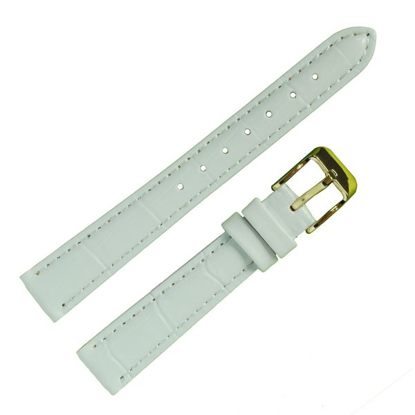 Высококачественный часовой ремешок бюджетной серии в стиле «Классика». Элегантный ремешок, у которого, верх, изготовлен из синтетической кожи на основе полиамидных смол, имитирующей кожу крокодила, цвет белый, со строчкой, по краю, в цвет ремешка, полу матовый. Низ или обратная сторона этого ремешка изготовлена из натуральной подкладочной кожи. Важными свойствами готовых изделий из синтетической кожи, изготовленной на основе полиамидных смол, являются: жесткость, прочность, устойчивость формы, гладкость поверхности, устойчивость цвета, износостойкость, низкая гигроскопичность, хорошо переносят действие химических реагентов, и не поддаются биохимическому воздействию. Модель ремешка — классическая, пухлая, дутая (padded-англ.), зауженная к пряжке. Конец длинной части ремешка имеет полукруглую острую форму. Пряжка классическая, элегантная и удобная в носке, изготовлена из нержавеющей стали с напыленным, на нее, покрытием из нитрида титана (TiN), имитирующим цвет золота. Возможно, заказать блестящую пряжку двух цветов: белый металл или под цвет золота, смотрите в каталоге модель 040 091 14 с пряжкой цвета — белый металл. Это изделие подходит к наручным часам низкой ценовой категории и выше.