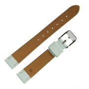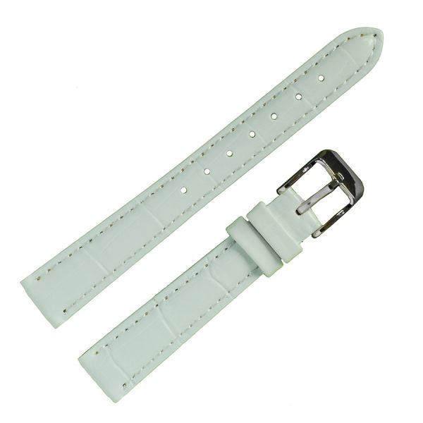 Высококачественный часовой ремешок бюджетной серии в стиле «Классика». Элегантный ремешок, у которого, верх, изготовлен из синтетической кожи на основе полиамидных смол, имитирующей кожу крокодила, цвет белый, со строчкой, по краю, в цвет ремешка, полу матовый. Низ или обратная сторона этого ремешка изготовлена из натуральной подкладочной кожи. Важными свойствами готовых изделий из синтетической кожи, изготовленной на основе полиамидных смол, являются: жесткость, прочность, устойчивость формы, гладкость поверхности, устойчивость цвета, износостойкость, низкая гигроскопичность, хорошо переносят действие химических реагентов, и не поддаются биохимическому воздействию. Модель ремешка — классическая, дутая (padded-англ.), зауженная к пряжке. Конец длинной части ремешка имеет полукруглую острую форму. Пряжка классическая, элегантная и удобная в носке, изготовлена из нержавеющей стали с покрытием из нитрида титана, цвет — белый металл. Возможно, заказать блестящую пряжку двух цветов: белый металл или под цвет золота, смотрите в каталоге модель 040 092 14 с пряжкой под цвет золота. Это изделие подходит к наручным часам низкой ценовой категории и выше.