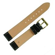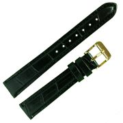 Высококачественный часовой ремешок бюджетной серии в стиле «Классика». Элегантный ремешок, у которого, верх, изготовлен из синтетической кожи на основе полиамидных смол, имитирующей кожу крокодила, цвет черный, со строчкой, по краю, в цвет ремешка, полу матовый. Низ или обратная сторона этого ремешка изготовлена из натуральной подкладочной кожи. Важными свойствами готовых изделий из синтетической кожи, изготовленной на основе полиамидных смол, являются: жесткость, прочность, устойчивость формы, гладкость поверхности, устойчивость цвета, износостойкость, низкая гигроскопичность, хорошо переносят действие химических реагентов, и не поддаются биохимическому воздействию. Модель ремешка — классическая, пухлая, дутая (padded-англ.), зауженная к пряжке. Конец длинной части ремешка имеет полукруглую острую форму. Пряжка классическая, элегантная и удобная в носке, изготовлена из нержавеющей стали с напыленным, на нее, покрытием из нитрида титана (TiN), имитирующим цвет золота. Возможно, заказать блестящую пряжку двух цветов: белый металл или под цвет золота, смотрите в каталоге модель 040 011 18 с пряжкой цвета — белый металл. Это изделие подходит к наручным часам низкой ценовой категории и выше.