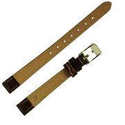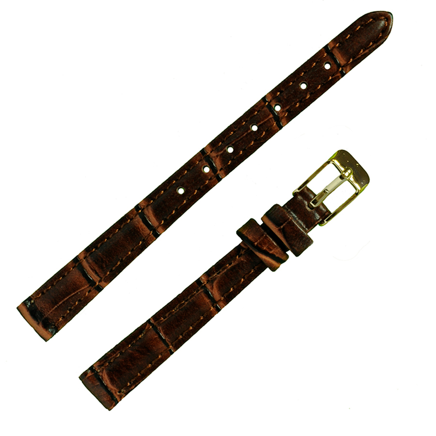 Высококачественный часовой ремешок бюджетной серии в стиле «Классика». Элегантный ремешок, у которого, верх, изготовлен из синтетической кожи на основе полиамидных смол, имитирующей кожу крокодила, цвет коричневый, со строчкой, по краю, в цвет ремешка, полу матовый. Низ или обратная сторона этого ремешка изготовлена из натуральной подкладочной кожи. Важными свойствами готовых изделий из синтетической кожи, изготовленной на основе полиамидных смол, являются: жесткость, прочность, устойчивость формы, гладкость поверхности, устойчивость цвета, износостойкость, низкая гигроскопичность, хорошо переносят действие химических реагентов, и не поддаются биохимическому воздействию. Модель ремешка — классическая, пухлая, зауженная к пряжке. Конец длинной части ремешка имеет полукруглую острую форму. Пряжка классическая, элегантная и удобная в носке, изготовлена из нержавеющей стали с напыленным, на нее, покрытием из нитрида титана (TiN), имитирующим цвет золота. Возможно, заказать блестящую пряжку двух цветов: белый металл или под цвет золота, смотрите в каталоге модель 040 021 10 с пряжкой цвета — белый металл. Это изделие подходит к наручным часам низкой ценовой категории и выше.