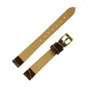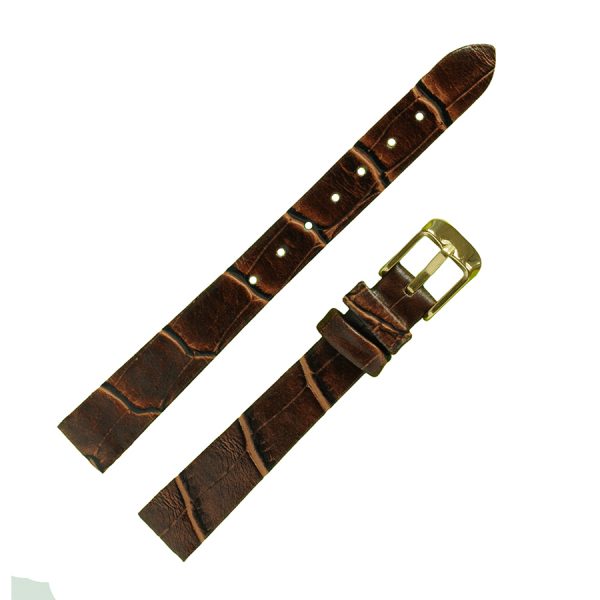 Высококачественный часовой ремешок бюджетной серии в стиле «Классика». Элегантный ремешок, у которого, верх, изготовлен из синтетической кожи на основе полиамидных смол, имитирующей кожу крокодила, цвет — коричневый, не прошитый , полу матовый. Низ или обратная сторона этого ремешка изготовлена из натуральной подкладочной кожи. Важными свойствами готовых изделий из синтетической кожи, изготовленной на основе полиамидных смол, являются: жесткость, прочность, устойчивость формы, гладкость поверхности, устойчивость цвета, износостойкость, низкая гигроскопичность, хорошо переносят действие химических реагентов, и не поддаются биохимическому воздействию. Модель ремешка — классическая, плоская, зауженная к пряжке. Конец длинной части ремешка имеет полукруглую острую форму. Пряжка классическая, элегантная и удобная в носке, изготовлена из нержавеющей стали с напыленным, на нее, покрытием из нитрида титана (TiN), имитирующим цвет золота. Возможно, заказать блестящую пряжку двух цветов: белый металл или под цвет золота, смотрите в каталоге модель 042 021 12 с пряжкой цвета — белый металл. Это изделие подходит к наручным часам низкой ценовой категории и выше.