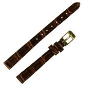 Высококачественный часовой ремешок бюджетной серии в стиле «Классика». Элегантный ремешок, у которого, верх, изготовлен из синтетической кожи на основе полиамидных смол, имитирующей кожу крокодила, цвет коричневый, со строчкой, по краю, в цвет ремешка, полу матовый. Низ или обратная сторона этого ремешка изготовлена из натуральной подкладочной кожи. Важными свойствами готовых изделий из синтетической кожи, изготовленной на основе полиамидных смол, являются: жесткость, прочность, устойчивость формы, гладкость поверхности, устойчивость цвета, износостойкость, низкая гигроскопичность, хорошо переносят действие химических реагентов, и не поддаются биохимическому воздействию. Модель ремешка — классическая, пухлая, зауженная к пряжке. Конец длинной части ремешка имеет полукруглую острую форму. Пряжка классическая, элегантная и удобная в носке, изготовлена из нержавеющей стали с напыленным, на нее, покрытием из нитрида титана (TiN), имитирующим цвет золота. Возможно, заказать блестящую пряжку двух цветов: белый металл или под цвет золота, смотрите в каталоге модель 040 021 12 с пряжкой цвета — белый металл. Это изделие подходит к наручным часам низкой ценовой категории и выше.