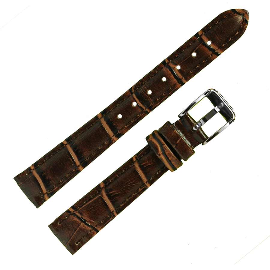 Высококачественный часовой ремешок бюджетной серии в стиле «Классика». Элегантный ремешок, у которого, верх, изготовлен из синтетической кожи на основе полиамидных смол, имитирующей кожу крокодила, цвет коричневый, со строчкой, по краю, в цвет ремешка, полу матовый. Низ или обратная сторона этого ремешка изготовлена из натуральной подкладочной кожи. Важными свойствами готовых изделий из синтетической кожи, изготовленной на основе полиамидных смол, являются: жесткость, прочность, устойчивость формы, гладкость поверхности, устойчивость цвета, износостойкость, низкая гигроскопичность, хорошо переносят действие химических реагентов, и не поддаются биохимическому воздействию. Модель ремешка — классическая, пухлая, зауженная к пряжке. Конец длинной части ремешка имеет полукруглую острую форму. Пряжка классическая, элегантная и удобная в носке, изготовлена из нержавеющей стали с покрытием из нитрид титана, цвет — белый металл. Возможно, заказать блестящую пряжку двух цветов: белый металл или под цвет золота, смотрите в каталоге модель 040 022 14 с пряжкой под цвет золота. Это изделие подходит к наручным часам низкой ценовой категории и выше.