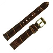 Высококачественный часовой ремешок бюджетной серии в стиле «Классика». Элегантный ремешок, у которого, верх, изготовлен из синтетической кожи на основе полиамидных смол, имитирующей кожу крокодила, цвет коричневый, со строчкой, по краю, в цвет ремешка, полу матовый. Низ или обратная сторона этого ремешка изготовлена из натуральной подкладочной кожи. Важными свойствами готовых изделий из синтетической кожи, изготовленной на основе полиамидных смол, являются: жесткость, прочность, устойчивость формы, гладкость поверхности, устойчивость цвета, износостойкость, низкая гигроскопичность, хорошо переносят действие химических реагентов, и не поддаются биохимическому воздействию. Модель ремешка — классическая, пухлая, зауженная к пряжке. Конец длинной части ремешка имеет полукруглую острую форму. Пряжка классическая, элегантная и удобная в носке, изготовлена из нержавеющей стали с напыленным, на нее, покрытием из нитрида титана (TiN), имитирующим цвет золота. Возможно, заказать блестящую пряжку двух цветов: белый металл или под цвет золота, смотрите в каталоге модель 040 021 14 с пряжкой цвета — белый металл. Это изделие подходит к наручным часам низкой ценовой категории и выше.