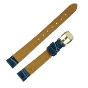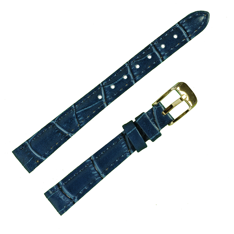 Высококачественный часовой ремешок бюджетной серии в стиле «Классика». Элегантный ремешок, у которого, верх, изготовлен из синтетической кожи на основе полиамидных смол, имитирующей кожу крокодила, цвет синий, со строчкой, по краю, в цвет ремешка, полу матовый. Низ или обратная сторона этого ремешка изготовлена из натуральной подкладочной кожи. Важными свойствами готовых изделий из синтетической кожи, изготовленной на основе полиамидных смол, являются: жесткость, прочность, устойчивость формы, гладкость поверхности, устойчивость цвета, износостойкость, низкая гигроскопичность, хорошо переносят действие химических реагентов, и не поддаются биохимическому воздействию. Модель ремешка — классическая, пухлая, зауженная к пряжке. Конец длинной части ремешка имеет полукруглую острую форму. Пряжка классическая, элегантная и удобная в носке, изготовлена из нержавеющей стали с напыленным, на нее, покрытием из нитрида титана (TiN), имитирующим цвет золота. Возможно, заказать блестящую пряжку двух цветов: белый металл или под цвет золота, смотрите в каталоге модель 040 051 12 с пряжкой цвета — белый металл. Это изделие подходит к наручным часам низкой ценовой категории и выше.