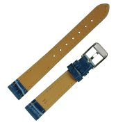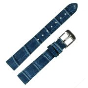 Высококачественный часовой ремешок бюджетной серии в стиле «Классика». Элегантный ремешок, у которого, верх, изготовлен из синтетической кожи на основе полиамидных смол, имитирующей кожу крокодила, цвет синий, со строчкой, по краю, в цвет ремешка, полу матовый. Низ или обратная сторона этого ремешка изготовлена из натуральной подкладочной кожи. Важными свойствами готовых изделий из синтетической кожи, изготовленной на основе полиамидных смол, являются: жесткость, прочность, устойчивость формы, гладкость поверхности, устойчивость цвета, износостойкость, низкая гигроскопичность, хорошо переносят действие химических реагентов, и не поддаются биохимическому воздействию. Модель ремешка — классическая, дутая (padded-англ.), зауженная к пряжке. Конец длинной части ремешка имеет полукруглую острую форму. Пряжка классическая, элегантная и удобная в носке, изготовлена из нержавеющей стали с покрытием из нитрида титана, цвет — белый металл. Возможно, заказать блестящую пряжку двух цветов: белый металл или под цвет золота, смотрите в каталоге модель 040 052 14 с пряжкой под цвет золота. Это изделие подходит к наручным часам низкой ценовой категории и выше.