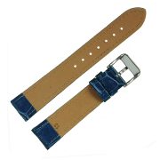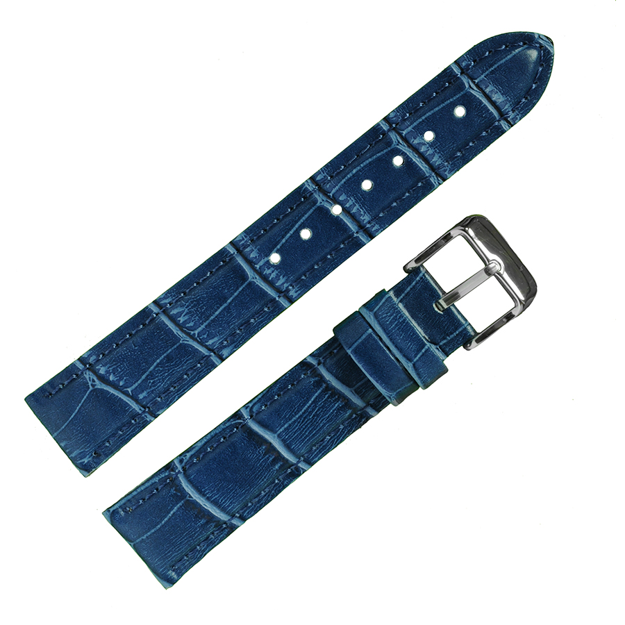 Высококачественный часовой ремешок бюджетной серии в стиле «Классика». Элегантный ремешок, у которого, верх, изготовлен из синтетической кожи на основе полиамидных смол, имитирующей кожу крокодила, цвет синий, со строчкой, по краю, в цвет ремешка, полу матовый. Низ или обратная сторона этого ремешка изготовлена из натуральной подкладочной кожи. Важными свойствами готовых изделий из синтетической кожи, изготовленной на основе полиамидных смол, являются: жесткость, прочность, устойчивость формы, гладкость поверхности, устойчивость цвета, износостойкость, низкая гигроскопичность, хорошо переносят действие химических реагентов, и не поддаются биохимическому воздействию. Модель ремешка — классическая, дутая (padded-англ.), зауженная к пряжке. Конец длинной части ремешка имеет полукруглую острую форму. Пряжка классическая, элегантная и удобная в носке, изготовлена из нержавеющей стали с покрытием из нитрида титана, цвет — белый металл. Возможно заказать эту модель ремешка в белом, чёрном, тёмно-бордовом, в светло-коричневом и коричневых цветах. Это изделие подходит к наручным часам низкой ценовой категории и выше.
