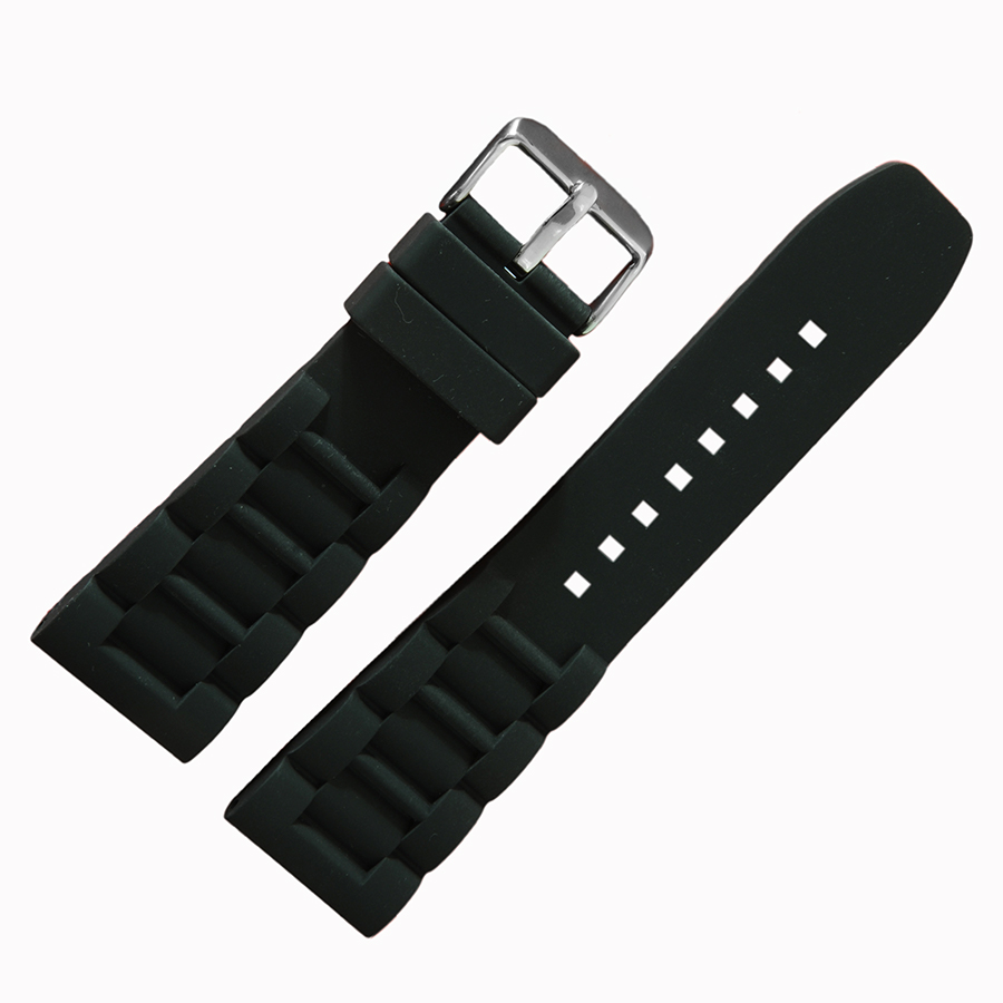 Высококачественный часовой ремешок из силикона в стиле «Спорт». Удлинённый и объёмный, цвет черный. Сликоновые ремешки мягкие и приятные к телу, комфортные и имеют длительный срок службы в носке. Этот часовой ремешок подходит, на замену, к наручным часам спортивных моделей, а так же к водонепроницаемым часам дайверов.