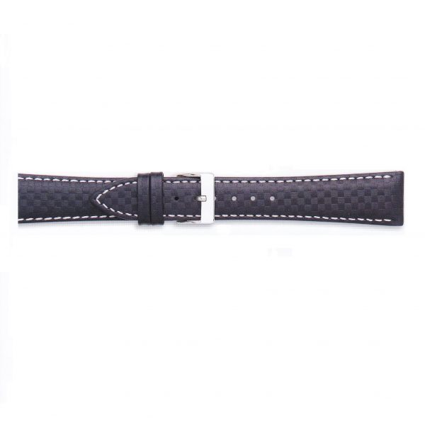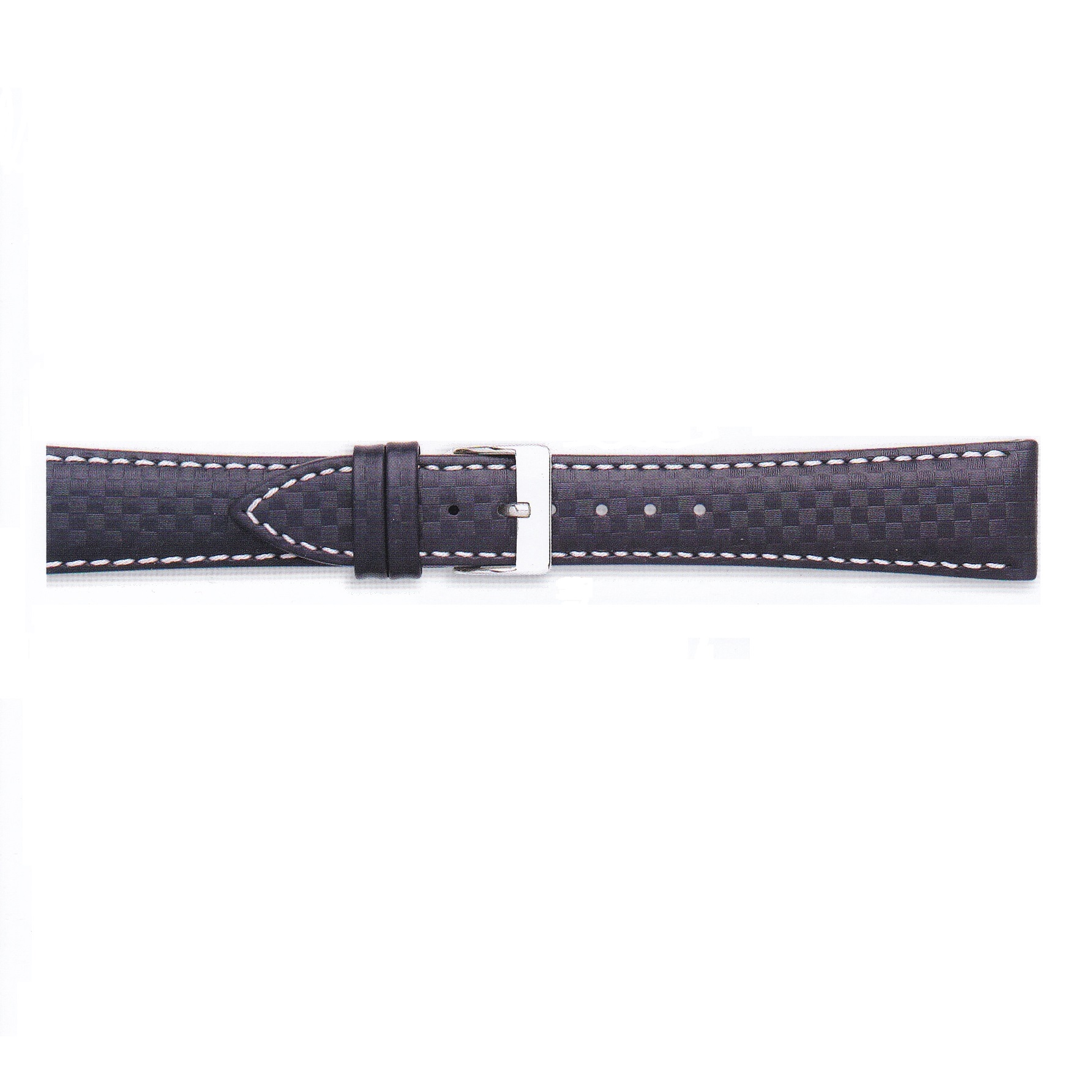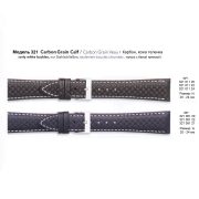 Высококачественный элегантный часовой ремешок, верх ремешка изготовлен из карбона (углеродного волокна) темно — синего цвета, а подкладка — из натуральной кожи черного цвета. Модель ремешка в стиле «Спорт», дутая (пухлая), с прошивкой по краю ремешка белого цвета, зауженная на 4 мм к пряжке по отношению к установочному концу ремешка. Конец длинной части ремешка имеет заостренную форму. Пряжка классическая, элегантная и удобная в носке, изготовлена из нержавеющей стали с покрытием из нитрида титана, цвет — белый металл. Имеются на складе размеры этой модели в 20 мм и 22 мм. Доступна так же эта модель в черном цвете с пряжкой под цвет белого металла, модель 321 011 24. Это изделие подходит к наручным часам средней ценовой категории и выше.