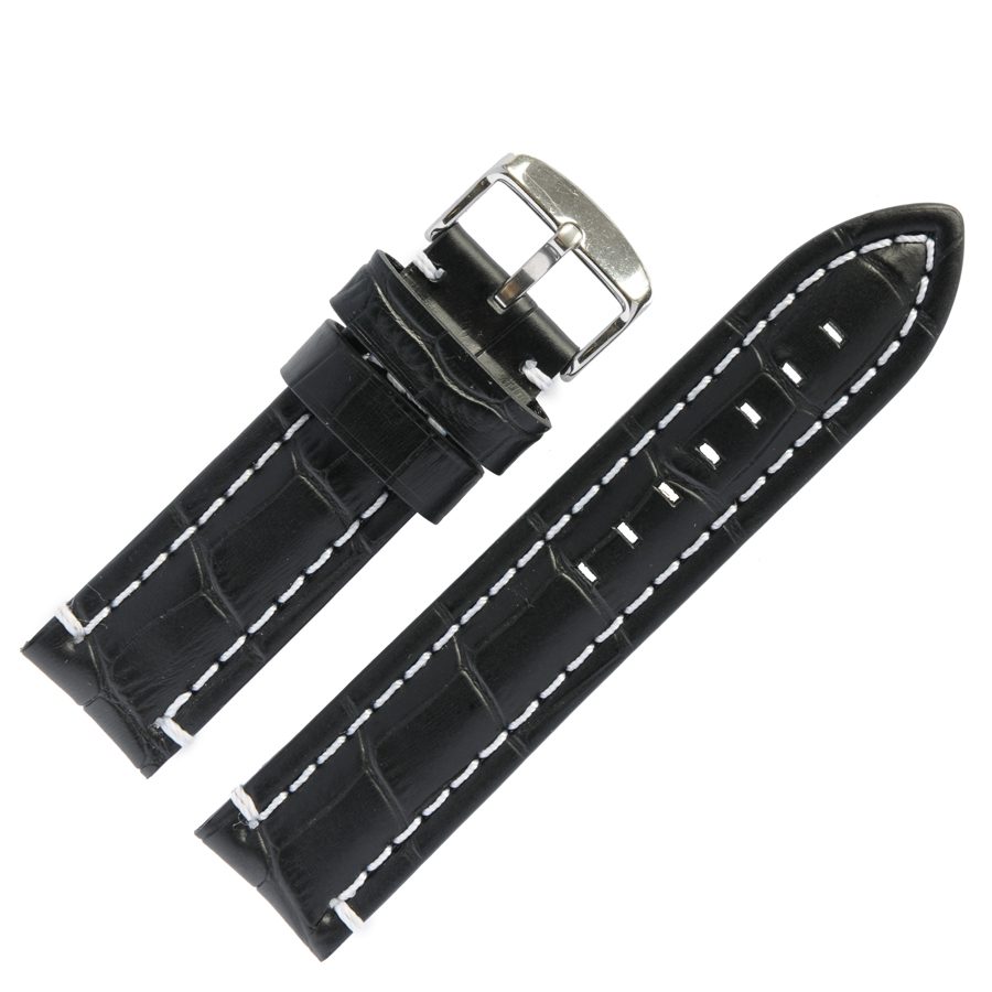 Высококачественный кожаный часовой ремешок в стиле «Спорт». Толстый и объемный, изготовлен из кожи буйвола, с выделкой, имитирующей кожу крокодила, цвет черный, с белой строчкой по краю ремня. Пряжка мощная, но одновременно элегантная и удобная в носке. Можно заказать такой ремешок и в коричневом цвете, модель 038 011 22 B. Данный кожаный часовой ремешок подходит, на замену, к наручным часам спортивных моделей, а так же к дорогим, брутальным моделям мужских наручных часов.