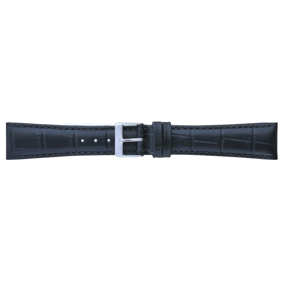 Элегантный ремешок, изготовлен из кожи теленка и так называемой «итальянской кожи», из — за высокого качества производства, имитирующей кожу аллигатора, с характерным параллельным рисунком ячеек, цвет — черный, поверхность — полуматовая. Конструкция ремешка — классическая, зауженная, пухлая (дутая), со строчкой, по краю, в цвет кожи ремешка. Пряжка классическая и удобная в носке, изготовлена из нержавеющей стали с напыленным, на нее, покрытием из нитрида титана (TiN), цвет — белый металл. Доступны так же размеры в 18 мм, 22 мм и 24 мм. Так же возможно заказать этот размер в коричневом цвете, в светло — коричневом и в белом цвете. Это изделие подходит к наручным часам средней ценовой категории и выше.