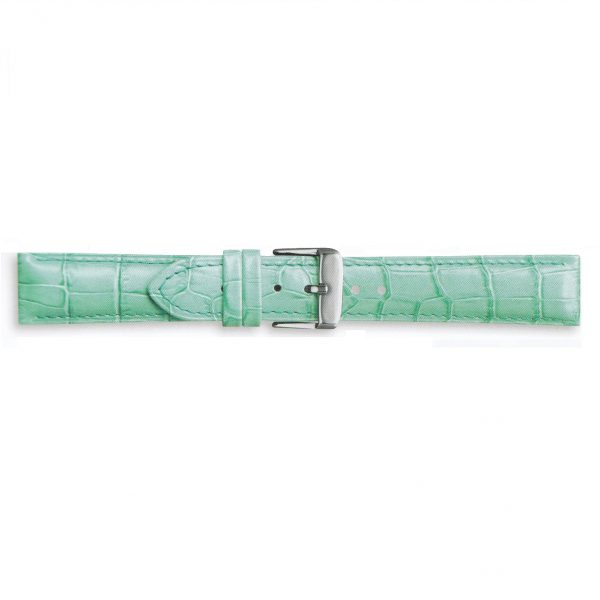 Элегантный ремешок, изготовлен из кожи теленка и так называемой «итальянской кожи», из-за высокого качества производства, с выделкой (фактурой) под кожу крокодила, цвет — бирюзовый, поверхность — глянцевая. Конструкция ремешка — классическая, дутая, со строчкой , по краю, в цвет кожи ремешка. Пряжка классическая и удобная в носке, изготовлена из нержавеющей стали с напыленным, на нее, покрытием из нитрида титана (TiN), цвет — белый металл. Эта модель выпускается только с белой пряжкой. Доступны размеры в 18 мм, 22 мм. Это изделие подходит к наручным часам средней ценовой категории и выше.