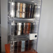 Стойка служит для хранения и экспонирования ремешков и браслетов. Стойка с 3-мя отсеками . В один из 3-х отсеков стойки, может поместится 19 групповых 8-ми ячеистых блистеров и, таким образом, в стойке можно разместить 456 ремешков (стандартная емкость стойки) с установочными размерами ремешков от 16 мм до 24 мм. Эта ёмкость может поменяться в большую или в меньшую сторону, если использовать групповые блистеры на 5, 6 и 12 ячеек, соответственно, под размер ремешков на 32-42 мм, 26-30 мм и 6-14 мм. Выкладка ремешков получается аккуратной и ровной и, даже, при использовании несколько разноячеистых групповых блистеров создается приятное и притягательное отношение покупателя к выставленной коллекции, а для продавца оперативность в продажах и не обременительной аккуратной выкладке товара. Стойка имеет электронный замок, который оберегает товар от кражи и позволяет продавцу иметь, практически, мгновенный доступ к этому товару.